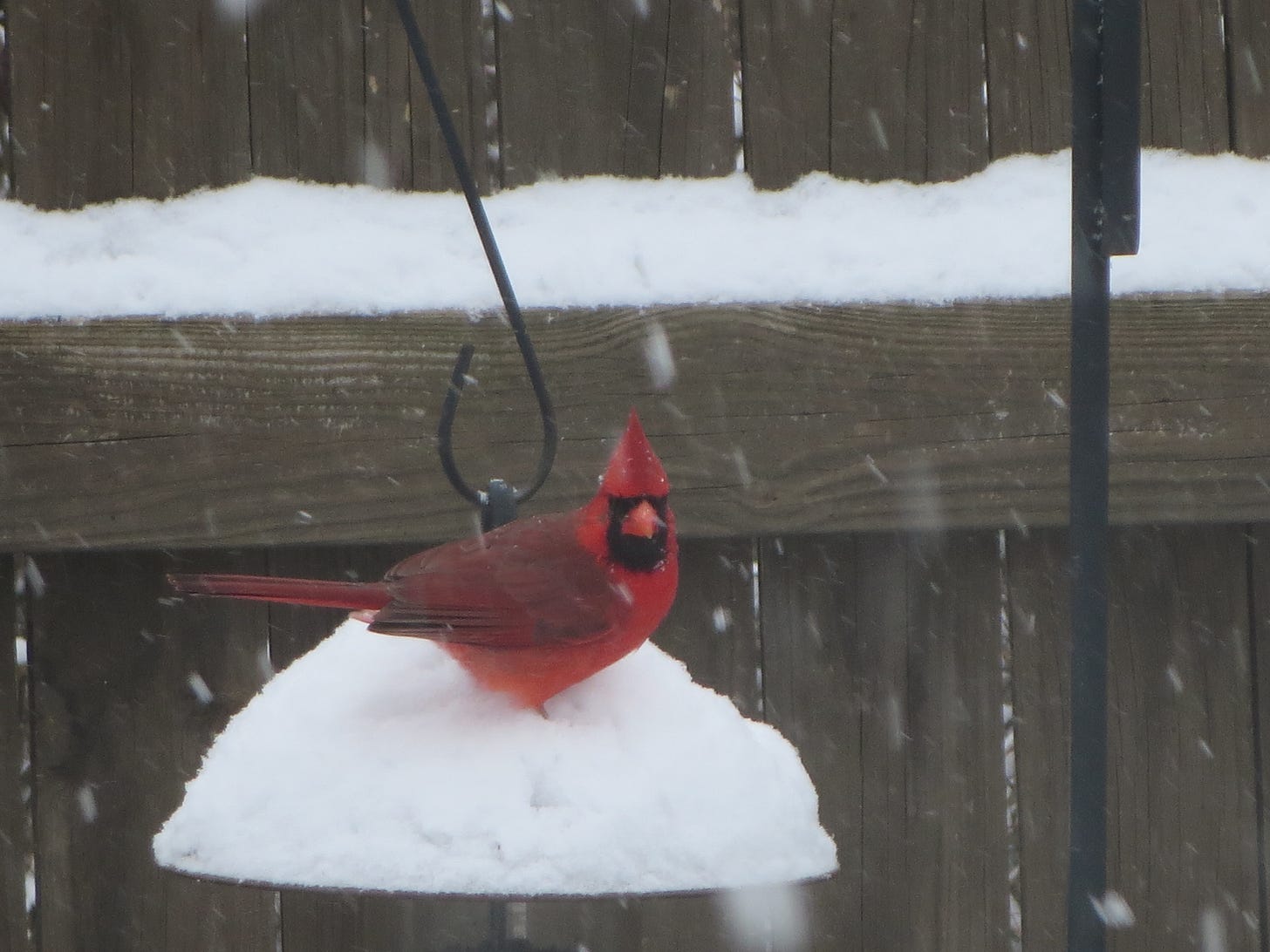 But a bird feeder changed that, and I had lots of time to see them, looking out from the glass paned French doors. I have a special memory of my first year here, and a gorgeous, regal male cardinal that would sit on the fence when I came to the dinner table. It took a few days to realize that he stayed there until I finished eating. Then, without another peck of seed for himself, he took off for his night somewhere in the woods behind me.