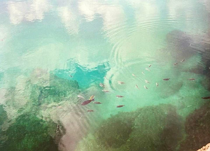 Off we went to Xel-Ha’ and an experience you can never have now. Coming over a small bridge from the buildings at the entrance, I saw the lagoon was crystal clear with small colored fish. We were shown the changing rooms where we could put a bathing suit on. But I found it was too hard to change into something because my clothes were literally stuck to me (really, that hot and humid).